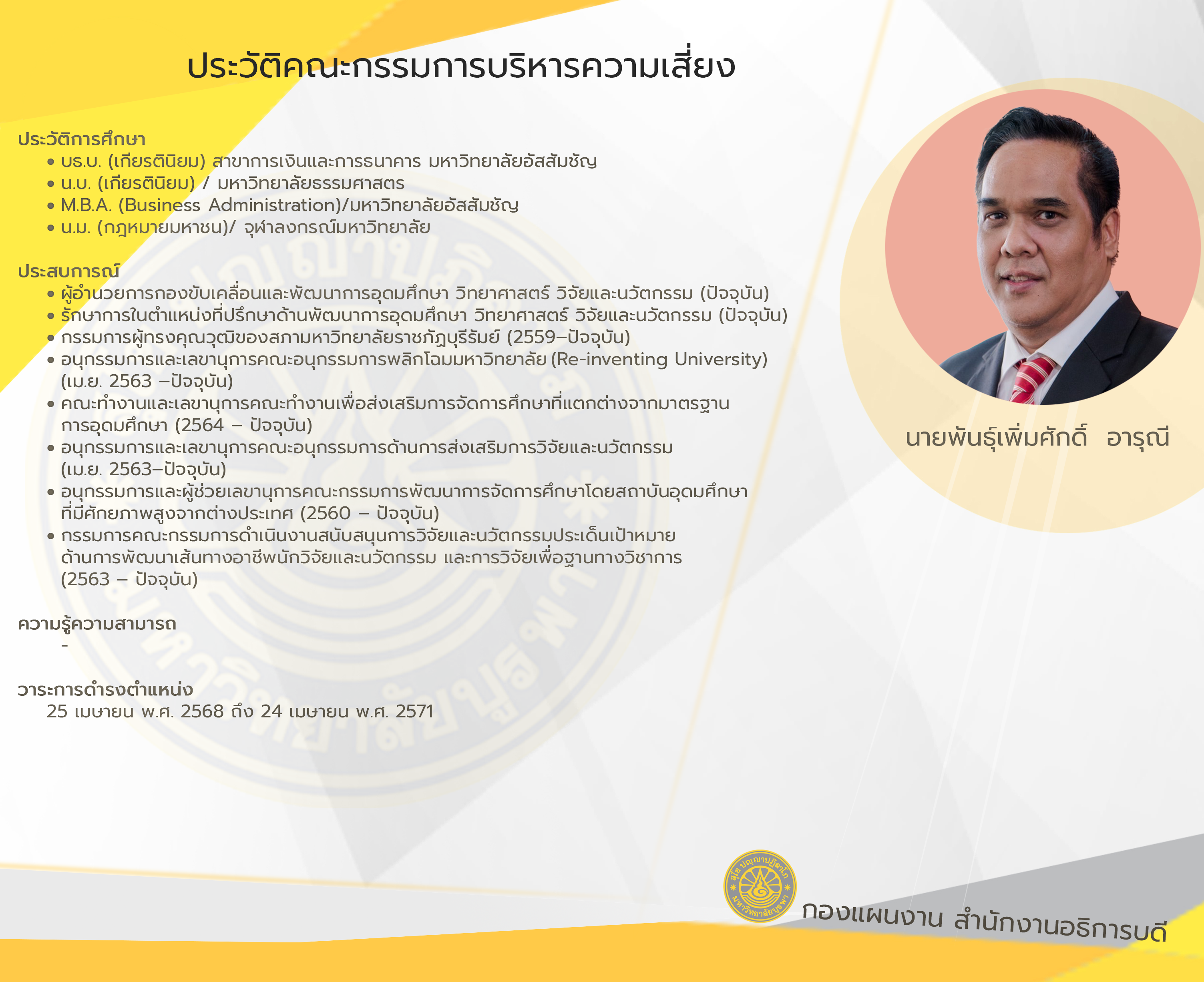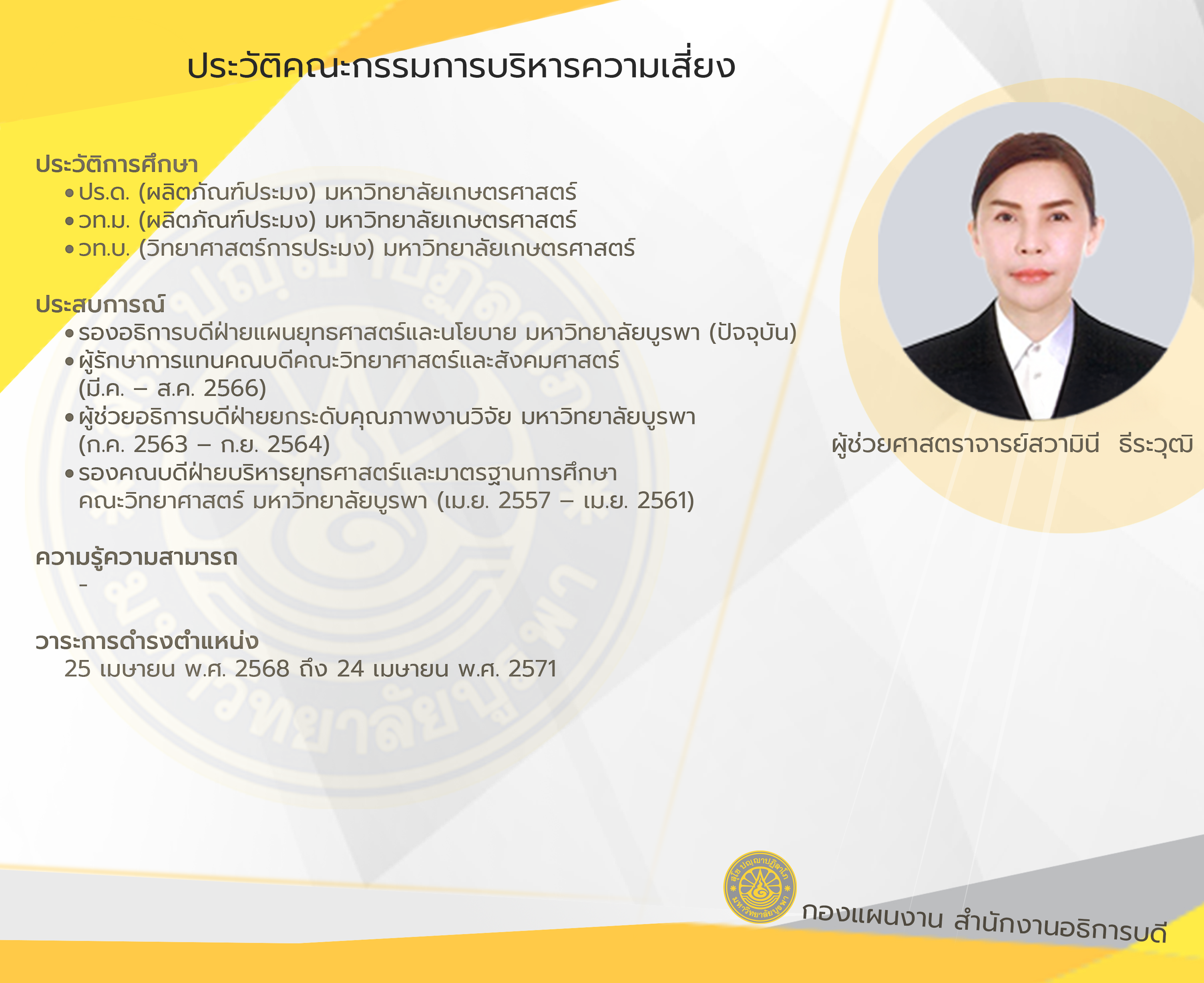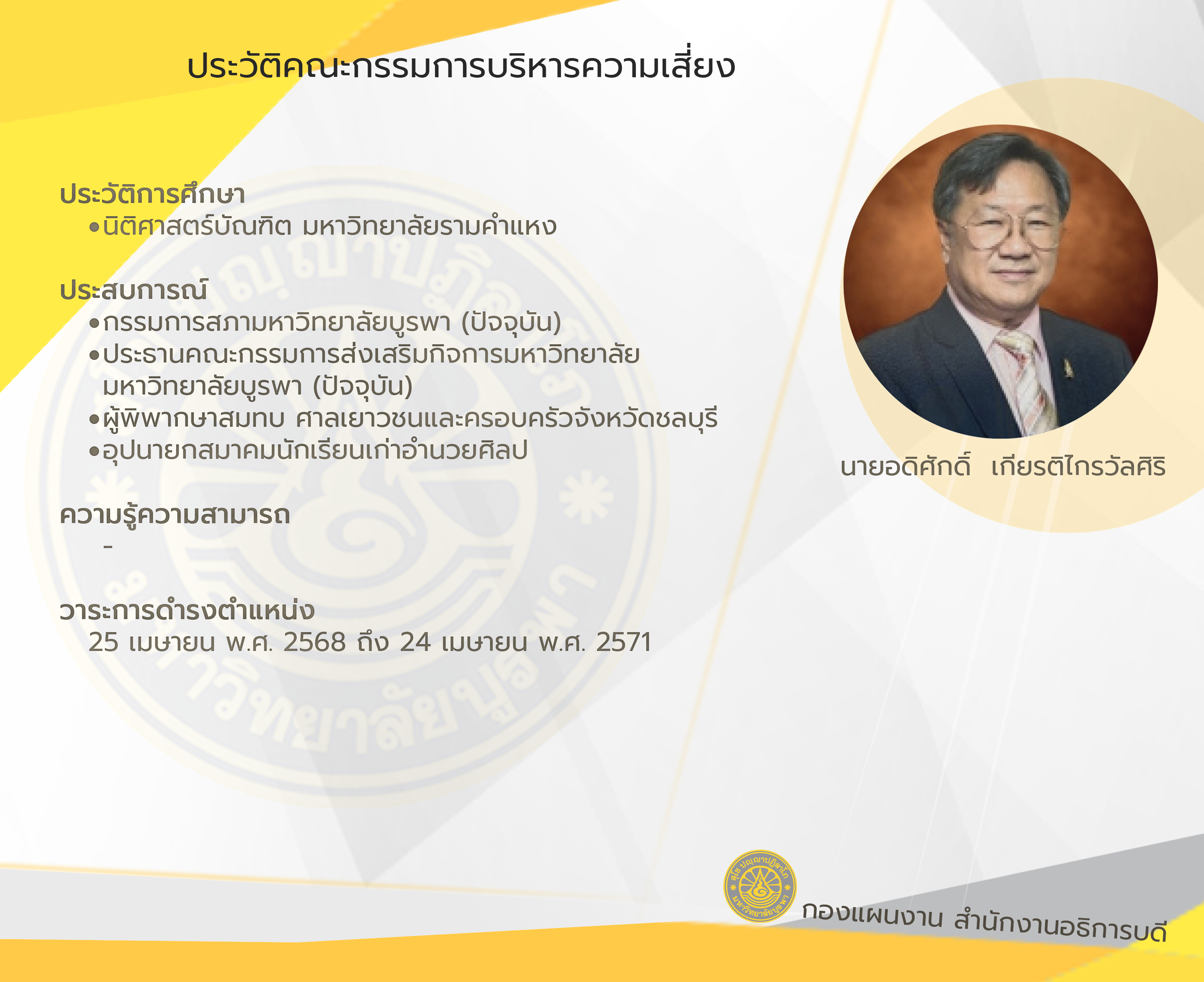 วาระ 25 เมษายน พ.ศ. 2568 ถึง 24 เมษายน พ.ศ. 2571 ตามคำสั่งสภามหาวิทยาลัยบูรพา เรื่อง แต่งตั้งคณะกรรมการบริหารความเสี่ยง