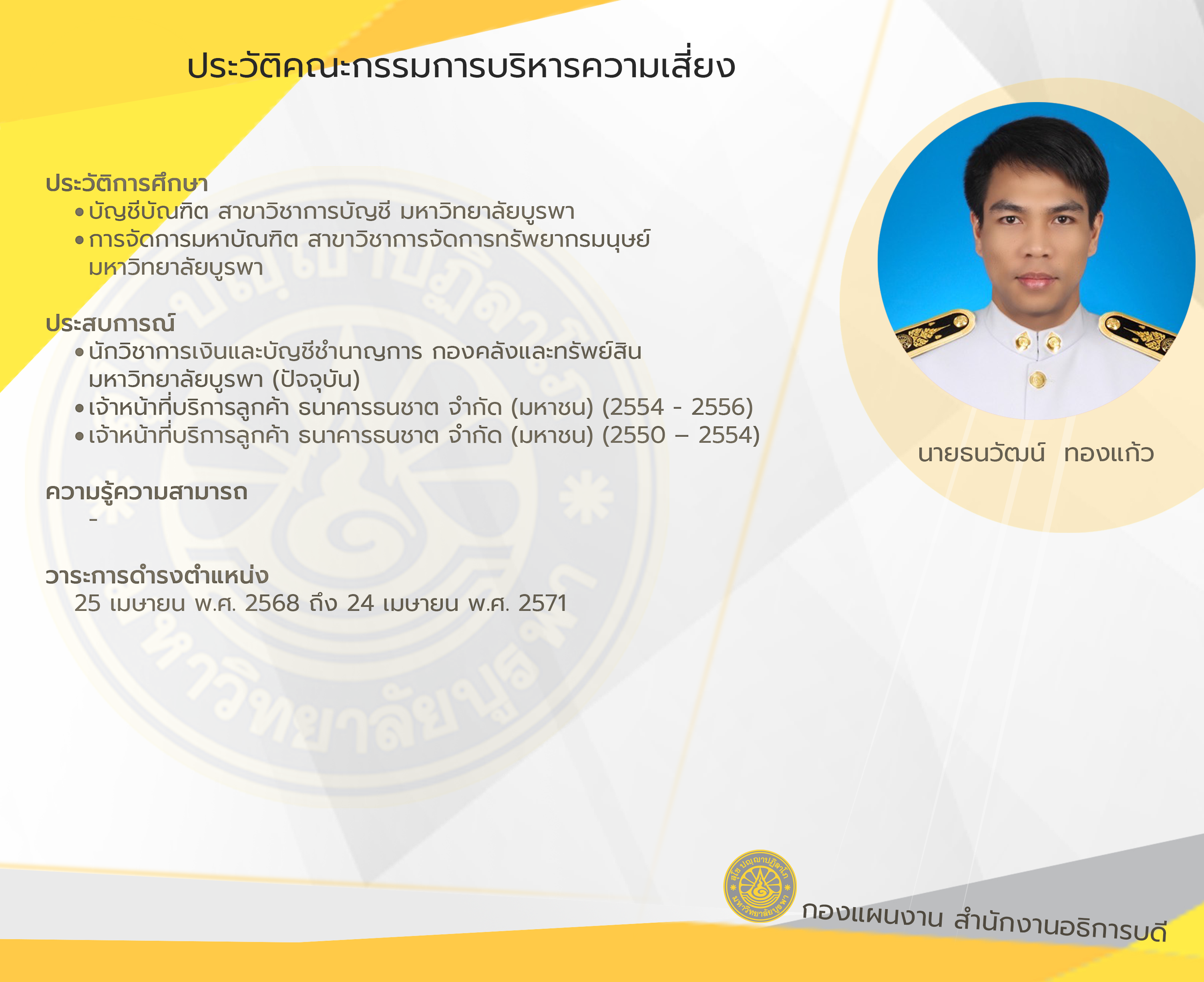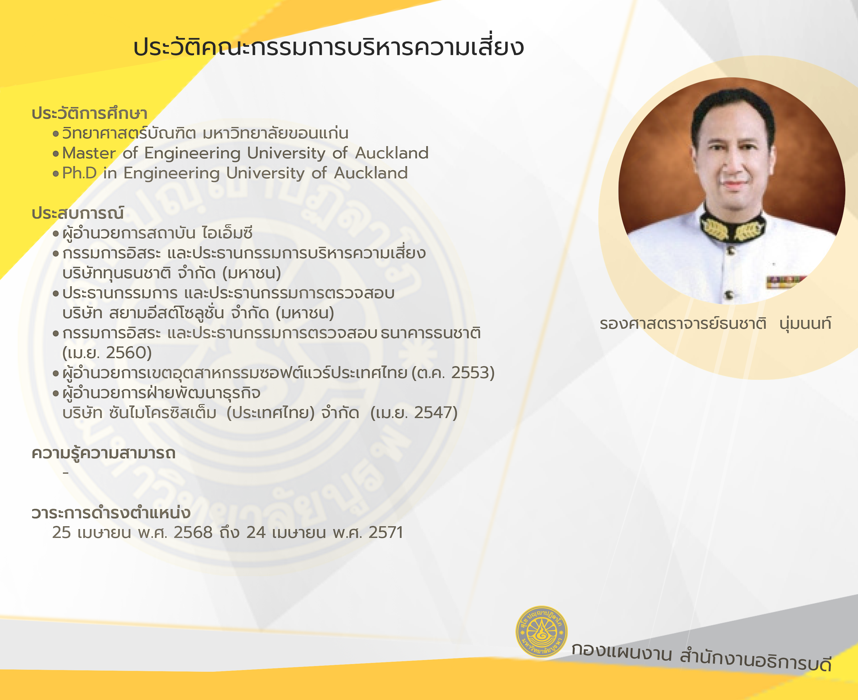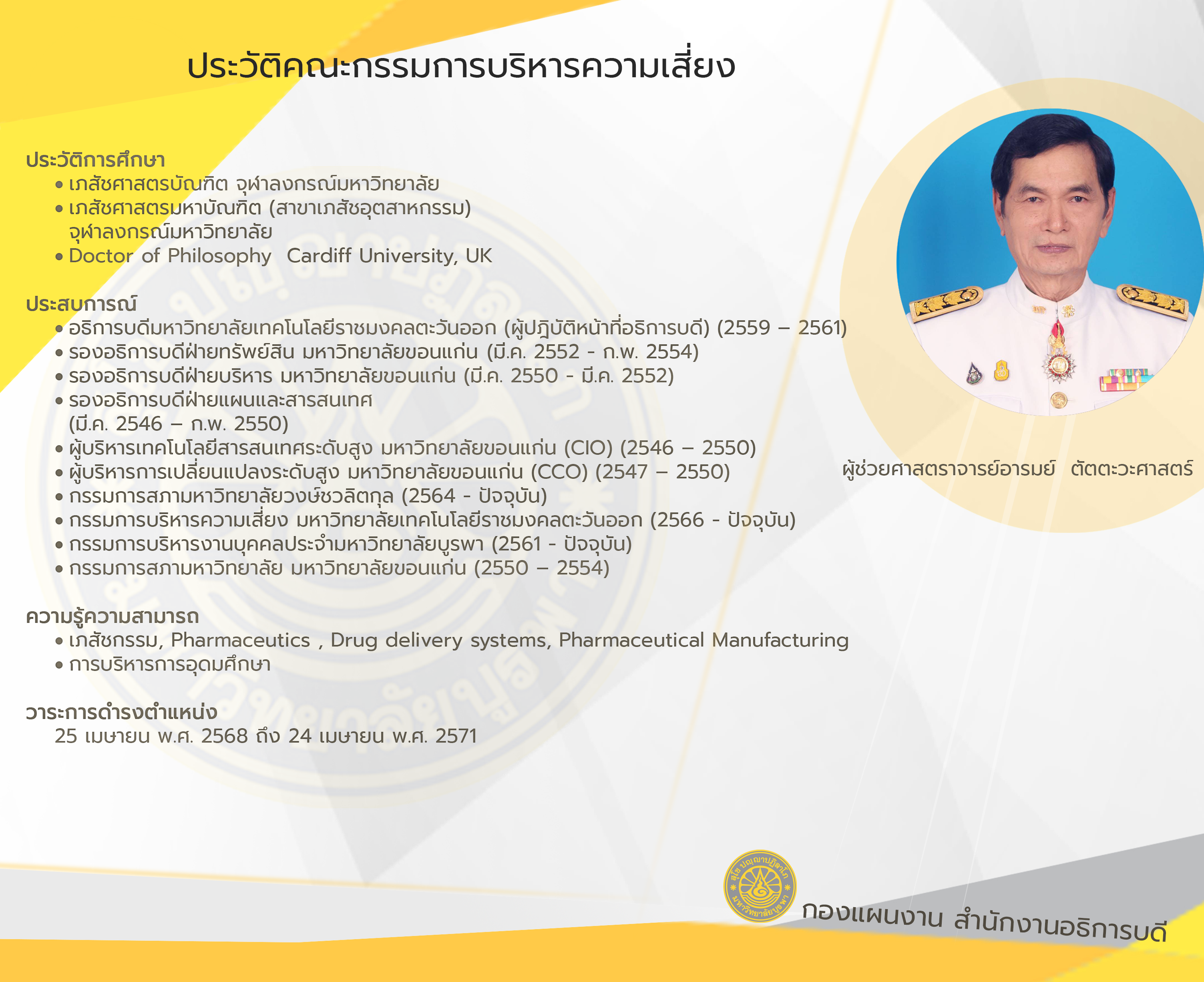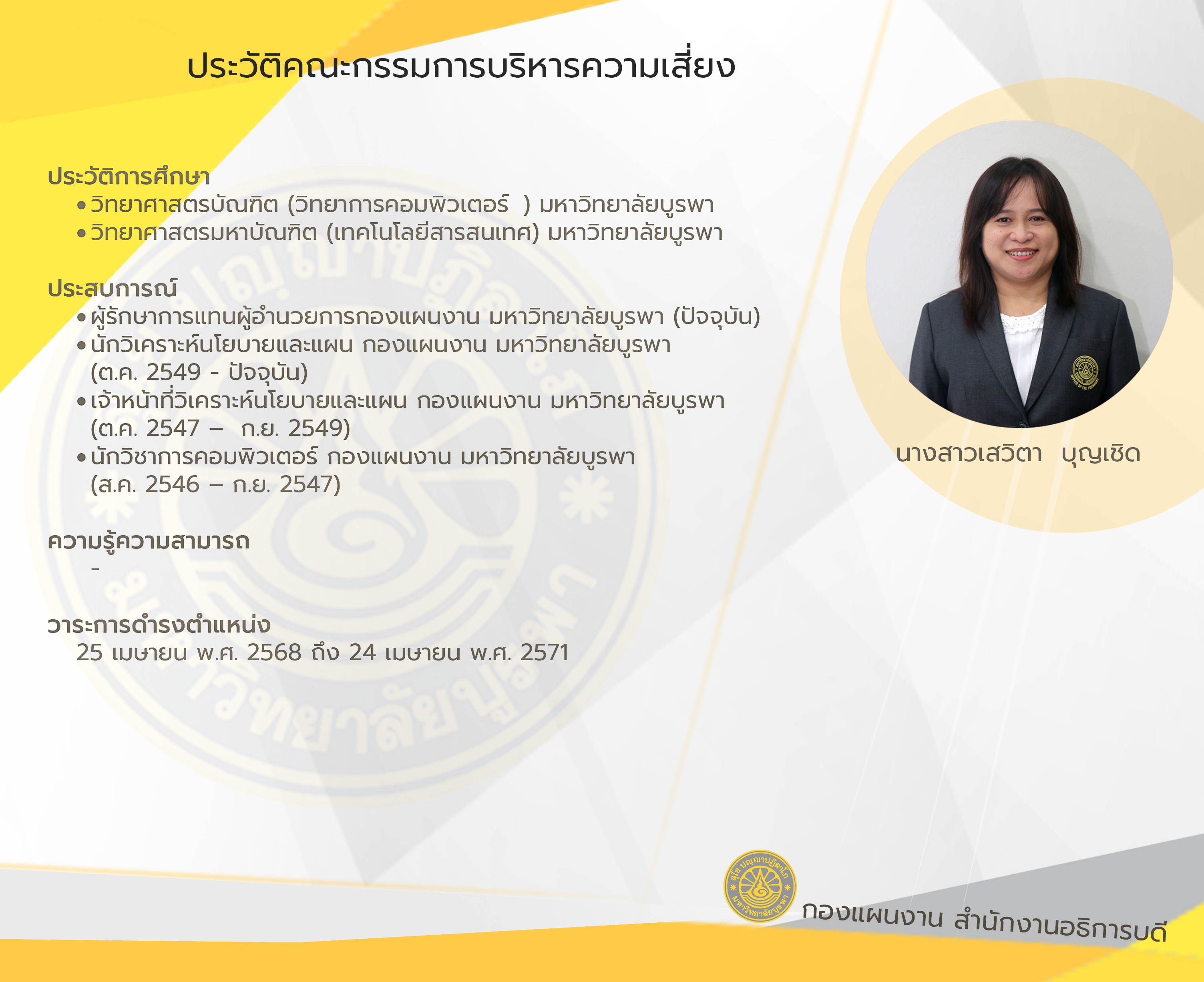 วาระ 25 เมษายน พ.ศ. 2568 ถึง 24 เมษายน พ.ศ. 2571 ตามคำสั่งสภามหาวิทยาลัยบูรพา เรื่อง แต่งตั้งคณะกรรมการบริหารความเสี่ยง